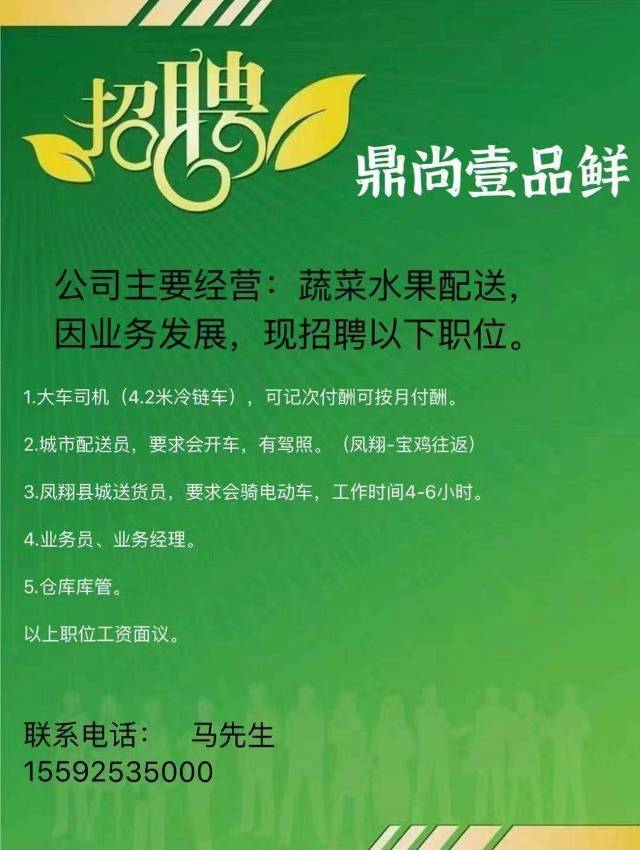 鼎尚壹品鲜招聘:公司主要经营:蔬菜水果配送,因业务发展,现招聘以下职位。1.大车司机(4.2米冷链车)。可记次付筹,可按月付筹。2.城市配送员,要求会开车,有驾照,(凤翔至宝鸡往返)。3.凤翔县城送货员,要求会骑电动车,工作时间4-6小时。4.业务员、业务经理。5.仓库库管。以上职位工资面议。联系电话:15592535000马先生